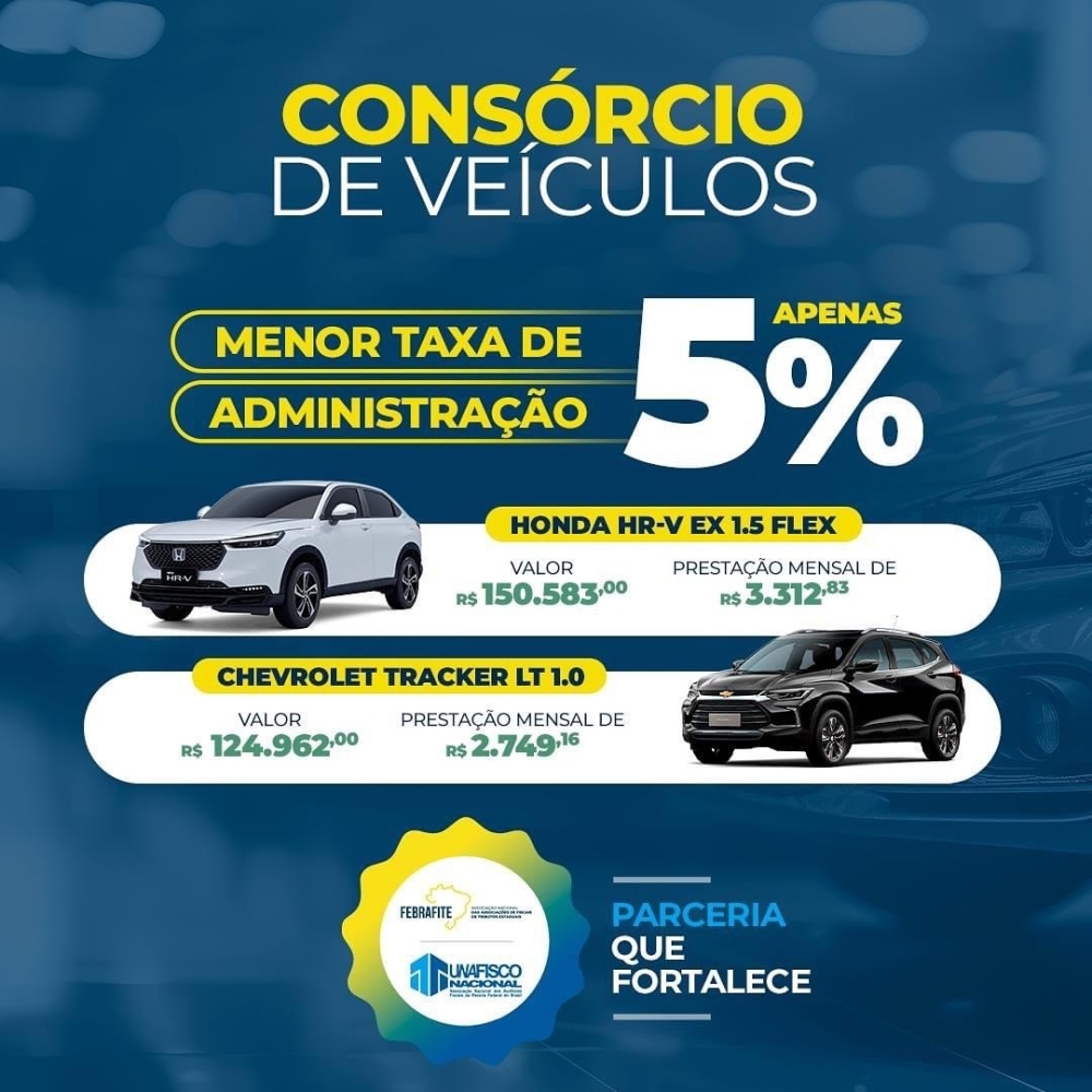 Consórcio de Veículos FEBRAFITE + Unafisco Nacional! Aproveite a menor taxa de administração do mercado, apenas 5%!