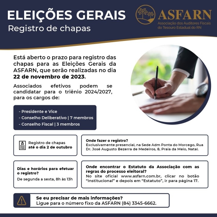 ELEIÇÕES GERAIS ASFARN: REGISTRO DE CHAPAS VAI ATÉ 2 DE OUTUBRO