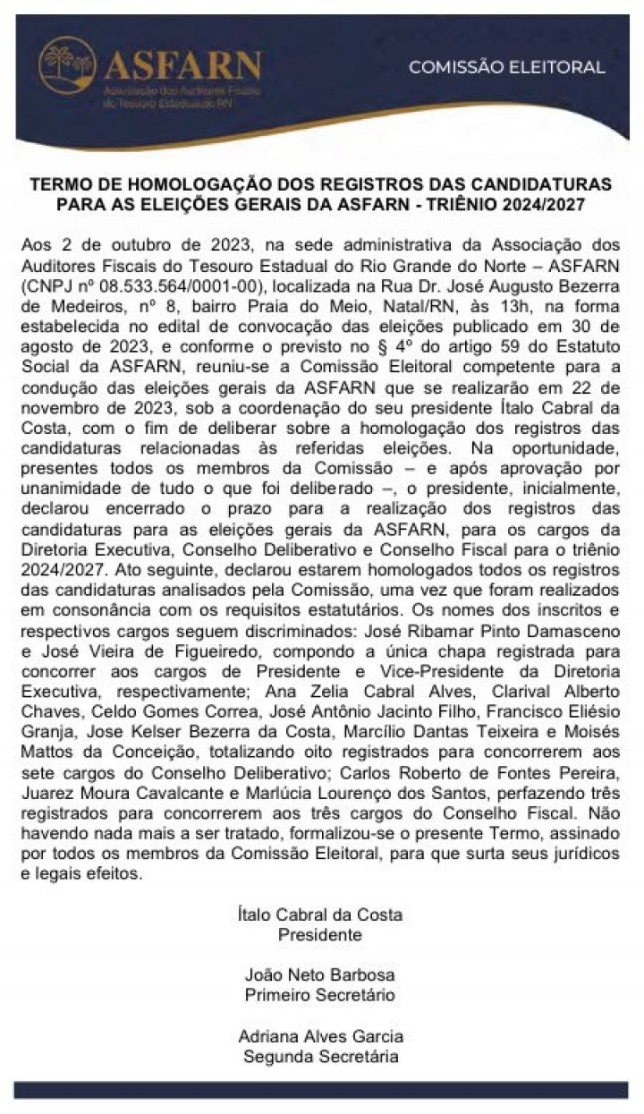 HOMOLOGAÇÃO DAS CHAPAS PARA AS ELEIÇÕES ASFARN É PUBLICADA EM JORNAL DO RN