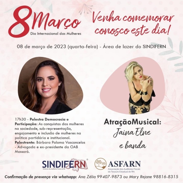 Anotaí! No dia 08 de março (quarta-feira), a partir das 17h30, em alusão ao Dia Internacional da Mulher, as Diretorias do SINDIFERN e da ASFARN convidam as colegas auditoras fiscais, aposentadas e pensionistas do Fisco RN, para desfrutarem de agradáveis momentos, na sede do Sindicato.