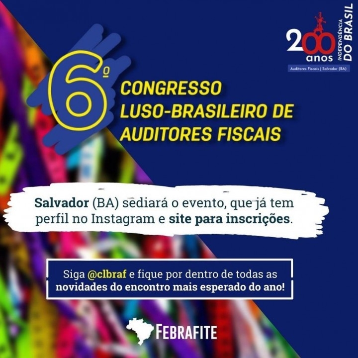 Em 2022, ano em que o Brasil celebra 200 anos de sua Independência, as Entidades realizadoras do 6º Congresso Luso-Brasileiro de Auditores Fiscais elegeram a cidade de Salvador (BA) - primeira capital do Brasil - para sediar o evento, que já tem perfil no Instagram e site para inscrições.