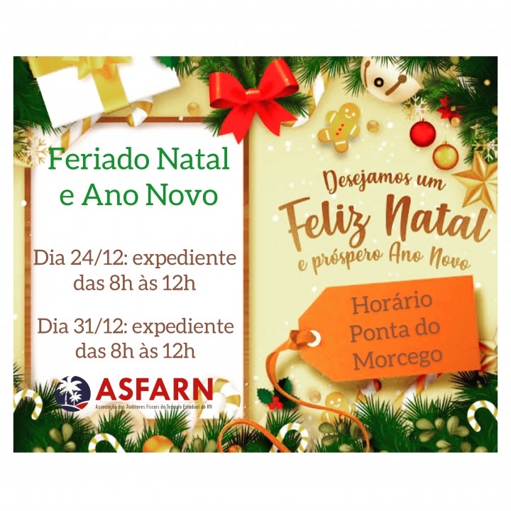 🔊 A ASFARN informa que não haverá expediente na sede administrativa, na Ponta do Morcego, no dia 31 de dezembro. A decisão segue o ponto facultativo decretado pelo Governo do Estado do RN; e ainda o fechamento dos bancos nesta data.