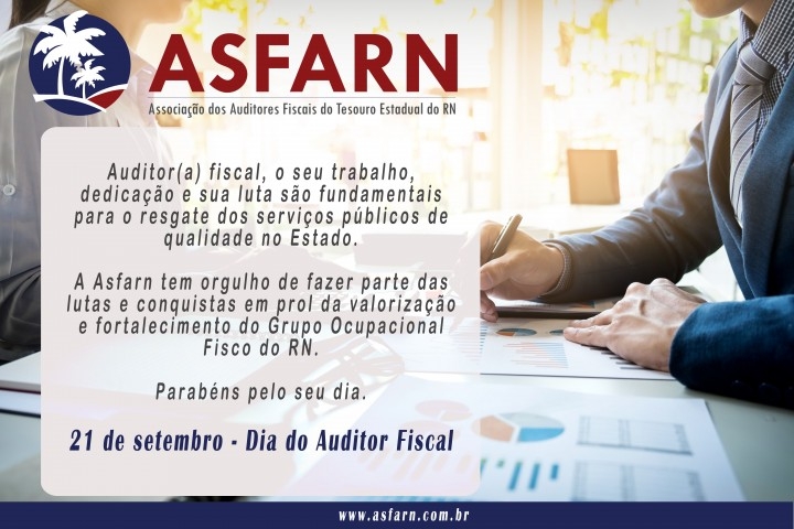 Auditor(a) fiscal, o seu trabalho, dedicação e sua luta são fundamentais para o resgate dos serviços públicos de qualidade no Estado. A Asfarn tem orgulho de fazer parte das lutas e conquistas em prol da valorização e fortalecimento do Grupo Ocupacional Fisco do RN. Parabéns pelo seu dia.