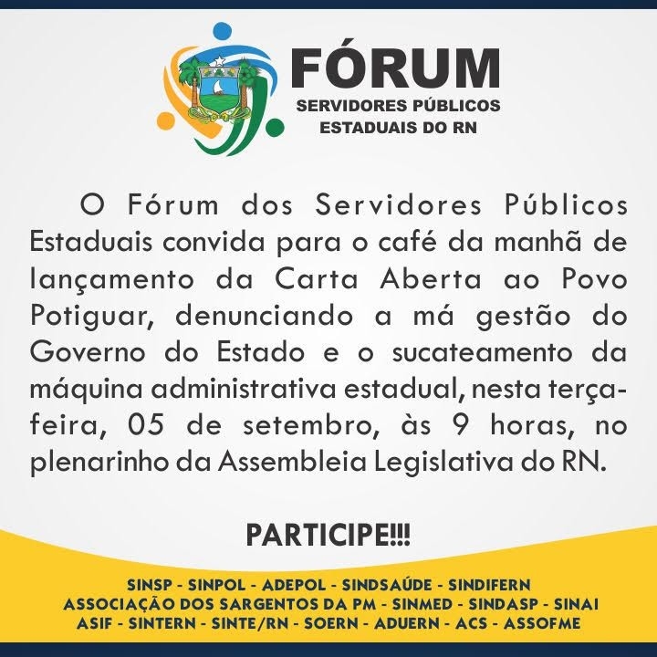 O Fórum dos Servidores Públicos do RN realiza nesta terça-feira, 05, um café da manhã no Plenarinho da Assembleia Legislativa, para o lançamento da Carta Aberta à População.