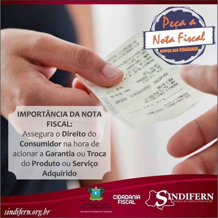 Com o objetivo de conscientizar o cidadão potiguar dos seus direitos e deveres relacionados à cidadania fiscal, a Secretaria de Estado da Tributação – SET/RN, com apoio do Sindicato dos Auditores Fiscais do Rio Grande do Norte – SINDIFERN, lança segunda-feira (28), uma campanha com o slogan: “Peça a Nota Fiscal. Exerça sua cidadania”.
